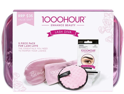 Give your lashes the perfect tint application all in the comfort of your home with the 1000 Hour Lash Diva 5 Piece Gift Set. It comes with a Lash & Brow Dye Kit, a reusable makeup remover pad, a spa headband and an eyemask, all packed in a cute pink beauty case.