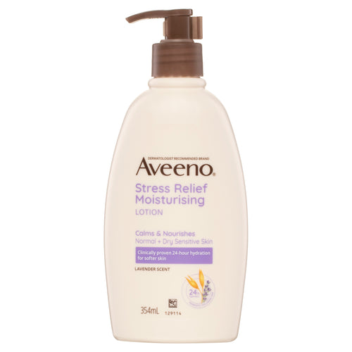 Aveeno Stress Relief Moisturising Lotion helps calm and relax with lavender scent, clinically proven to moisturise for 24 hours. Prebiotic Colloidal Oat Formula is non-greasy, fast-absorbing, giving you healthier-looking skin from day one.