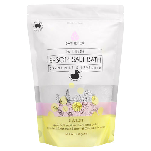 Kids Calm Chamomile & Lavender helps soothe your little one. Chamomile soothes sensitive skin, Lavender essential oil creates a sense of calm promoting a better night’s sleep and pure Epsom Salts help ease pains from a busy day of play.