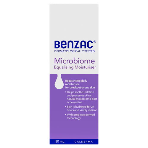Benzac Microbiome Equalising Moisturiser is a rebalancing daily moisturiser for breakout-prone skin, specially developed to soothe skin irritation and discomfort, instantly hydrate and retain moisture for 24 hours. With probiotic-derived technology, this non-comedogenic moisturiser maintains the skin’s natural pH to help preserve its microbiome and reduce the appearance of spots. Use as the final step in your three-step acne-fighting skin care routine.