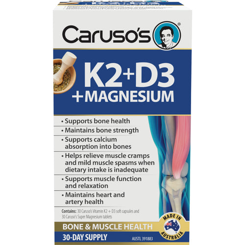 Caruso’s K2+D3+Magnesium contains six forms of Magnesium in a time-release formula which releases Magnesium into the body over an eight-hour period. Magnesium supports muscle health, healthy muscle contraction and muscle relaxation. It helps to relieve muscle cramps and mild muscle spasms, and reduce the occurrence of muscle cramps, when dietary intake is inadequate. Magnesium also maintains the health and function of the nervous system, supports a healthy stress response in the body, and helps to relieve symptoms of premenstrual tension.