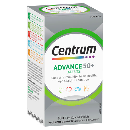 Centrum Advance 50+ is designed for adults aged 50+ and contains multiple vitamins to help fill nutritional gaps supporting multiple health benefits: