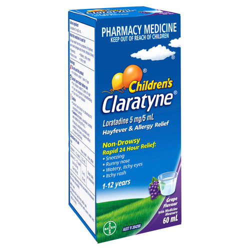 Children's Claratyne Grape Syrup provides rapid 24 hour, non-drowsy relief from hayfever, year round allergies and chronic urticaria (hives).
