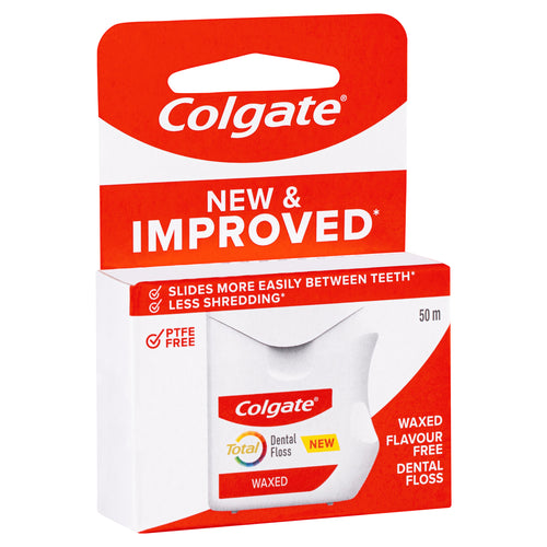 NEW AND IMPROVED* Colgate Total Waxed Dental Floss slides more easily between the teeth*, less shredding* and reaches areas that brushing can't - for improved mouth health.