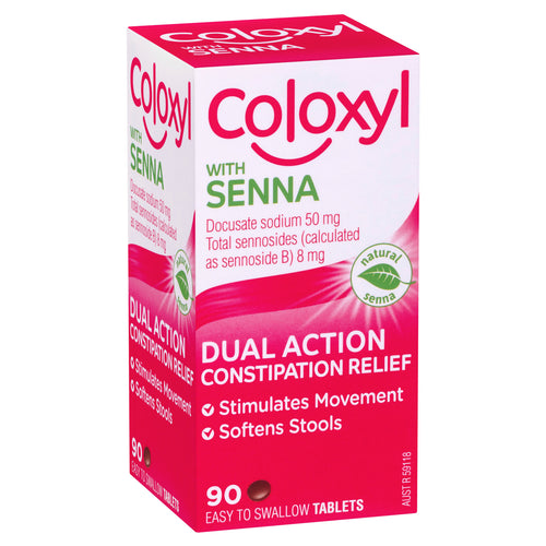 COLOXYL with SENNA is a dual action formula providing fast constipation relief within 6-12 hours. The combination of two active ingredients helps make bowel movements easier by both softening stools and stimulating the muscles in the bowel. It is available in easy to swallow tablets for overnight relief. And it is suitable for use in adults and children 12 years and over, including those who take constipation-inducing medications, such as opioids.
