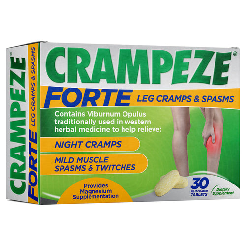 Crampeze Forte Leg Cramps & Spasms contains Viburnum Opulus, an antispasmodic (Cramp Bark) traditionally used in western herbal medicine to help relieve night cramps and mild muscle spasms & twitches. It also contains nicotinamide, feverfew extract and vitamin B5.