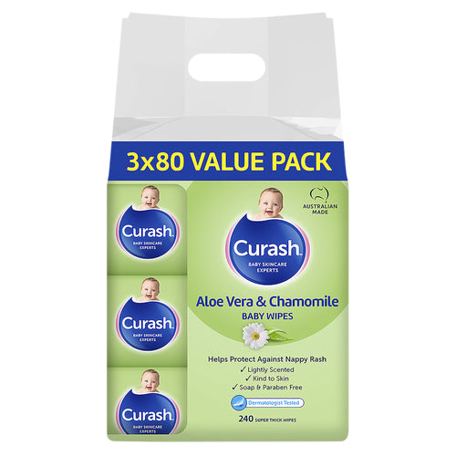 Curash Aloe Vera & Chamomile baby wipes are developed with your baby’s delicate skin in mind. They are lightly scented and specially formulated baby wipes to soothe and calm delicate skin.