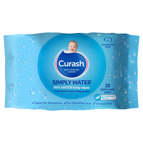 Curash™ Simply Water ™ Baby Wipes contain 99% water and are specially formulated with 0% alcohol, soap or parabens. They are pH balanced and dermatologically tested to be suitable for newborns' delicate skin. Curash Simply Water Baby Wipes are soft and gentle for baby, but also thick and strong for you. The Curash™ brand was originally developed by a doctor in Sydney, Australia, and has been caring for baby's skin for over 35 years.