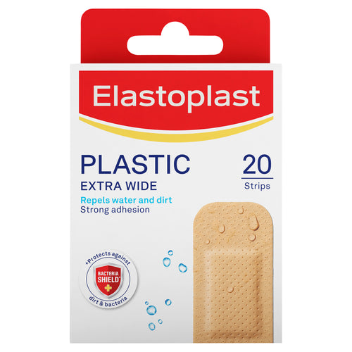 Elastoplast Water Resistant Plastic Wide Strip Plasters with Elastoplast Bacteria Shield* are suitable to cover and protect all data-types of minor, everyday wounds. The material is breathable and water-resistant to help protect your wound from moisture and water, whilst the non-stick wound pad is designed to protect and cushion the wound. The strong adhesion ensures that the plaster stays in place, making them appropriate for use over joints and other moving parts of the body. The plasters are available as strips in different sizes which seal all around the wound, and as a dressing length which can be cut to the ideal size. Only for small wounds, minor cuts and grazes. Apply the plaster without stretching to achieve best results. The plaster also contains 0% latex.