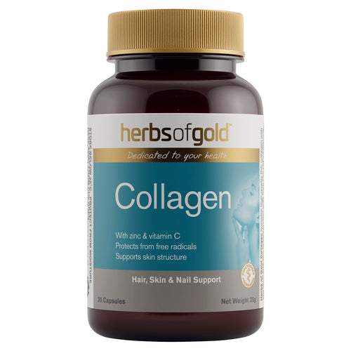 Herbs of Gold Collagen, in conjunction with antioxidant support from vitamin C and zinc, contributes to normal collagen formation for the normal function and maintenance of skin, skin structure, wound healing and normal hair and nails.