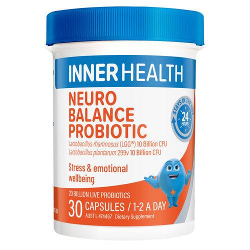 Taking Neuro Balance daily supports gut & brain health, maintains emotional wellbeing, and supports mental focus, clarity & recall with targeted probiotic strains LGG® and 299v.