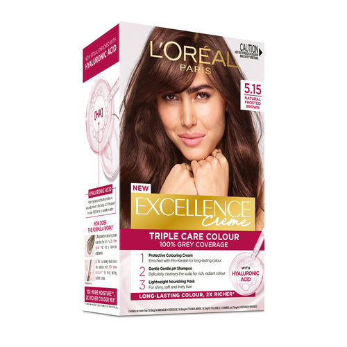 Experience visibly better hair quality than before colouring with Excellence Crème by L'Oréal Paris, now enriched with Hyaluronic Acid. 100% grey coverage from root to tip. L'Oréal Paris Excellence Crème gives you a rich, deep, natural and even colour available in a wide spectrum of shades. Our Triple Care Colour ritual cares for your colour, cares for your scalp and cares for your hair. The protective colouring cream is enriched with Pro-Keratin for long lasting colour. The new caring gentle post-colour shampoo delicately cleanses the scalp and smooths the hair to reveal its radiance. Complete your routine with the new caring lightweight mask that intensively nourishes the hair without weighing it down.