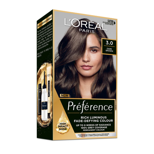 L'Oréal Paris Préférence Permanent hair colour, now featuring a luxurious oil-in-gel no drip formula for lasting, multidimensional colour. With a high concentration of dyes, Préférence provides 9 weeks of fade-defying* and multidimensional colour, respecting the hair’s natural highs and lows, for a look that is radiant, luminous and lasting. It’s suitable for all hair textures, offering fade-defying colour* and multidimensional shine and 100% grey coverage**. FADE-DEFYING COLOUR Préférence has a high concentration of high-tenacity dyes that penetrate hair fibres for 9 weeks of fade-defying colour*. LIQUID GEL TECHNOLOGY Formulated with an innovative oil-in-gel formula, Préférence perfectly coats the hair so that light bounces back for an even, natural shine. The innovative Liquid Gel Technology locks in the dyes to accentuate reflections, revealing multidimensional colour with intense radiance. The bonus: this new formula doesn’t drip for an easy, mess-free application at home. *Consumer test except for copper/red shades. ** Instrumental tests on grey hair swatches before and after using Préférence.