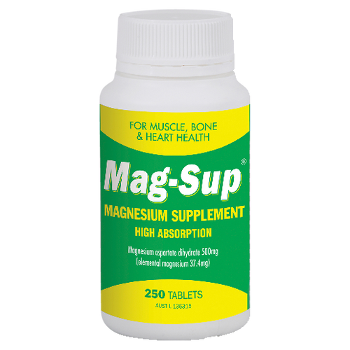 Mag-Sup 250 Tablets are a high potency magnesium supplement for use in magnesium deficiencies. Magnesium is an essential mineral important for the normal function of nerves, muscles, bones and heart.