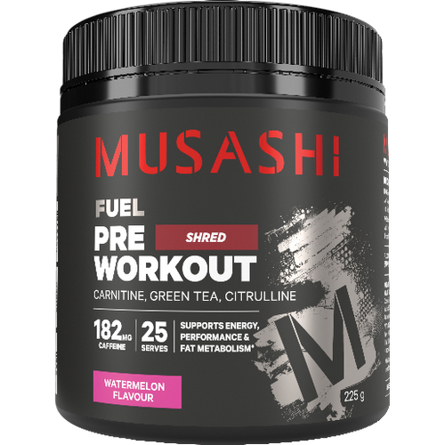 Musashi Pre-Workout Shred is a functional, thermogenic formula designed to support fat metabolism and energy production in a delicious, easy-mixing supplement blend. Scientifically formulated with carnitine, citrulline, green tea extract, 182mg of caffeine and vitamin B5 to support energy production and reduce tiredness and fatigue during high intensity training.