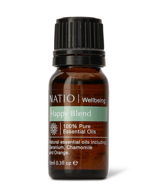 Invite a smile to your face with this uplifting blend of 100% pure and natural essential oils. An expert mix of essential oils often used to help stimulate positive energy, inner harmony and contentment - including Geranium, Chamomile and Orange - this synergistic, sweetly floral “Happy” blend helps to stimulate peace of mind and a sense of happiness. Part of Natio's Wellbeing Pure Essential Oils range; made with pure natural essential oils from around the world, bottled in Australia.