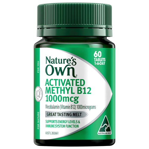 Nature’s Own Activated Methyl B12 1000mcg Mini Melt Tablets can be used to support energy levels and healthy immune system function, assist healthy red blood cell production, and support Vitamin B12 levels in the body. Made with an active form of B12 found in the human body, Nature’s Own Activated Methyl B12 1000mcg can be taken as a one-a-day great tasting melt, for convenience and easy absorption. Adults simply dissolve one tablet under the tongue daily; Vitamin supplements should not replace a balanced diet. Nature’s Own Activated Methyl B12 is Australian-made with no added gluten, lactose, sugar, artificial colours, artificial flavours, artificial sweeteners, artificial preservatives, dairy products or animal-derived products. Always read the label and follow the directions for use.