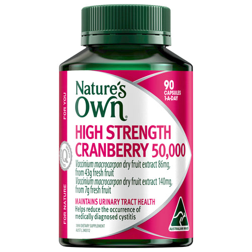 Support urinary tract and kidney health in healthy adults and help reduce the occurrence of medically diagnosed cystitis with Nature’s Own High Strength Cranberry 50,000 Capsules. Made with naturally derived cranberry fruit (Vaccinium macrocarpon) extract dry concentrate, Nature’s Own High Strength Cranberry 50,000 also helps reduce free radical damage to body cells, supports oral health, and helps you maintain your body’s general well-being. Australian Made®, and rigorously tested to ensure quality, potency, and purity, Nature’s Own High Strength Cranberry 50,000 capsules contain no added gluten, lactose, artificial colours or flavours, artificial sweeteners, or dairy products. Always read the label and follow the directions for use. Adults, take 1 capsule daily with food or as recommended by your healthcare professional. If pain or irritation persists for more than 48 hours consult your doctor; the presence of blood in the urine warrants immediate medical attention. Contains sulfur dioxide.