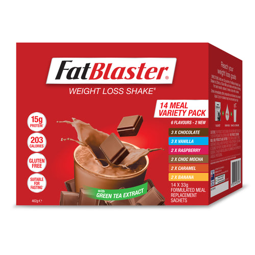 Reach your weight loss goals with the FatBlaster variety pack. A great way to shake up your routine and indulge your taste buds. The FatBlaster Variety Pack has your favourite FatBlaster flavours, plus two new delicious flavours - caramel and banana.
