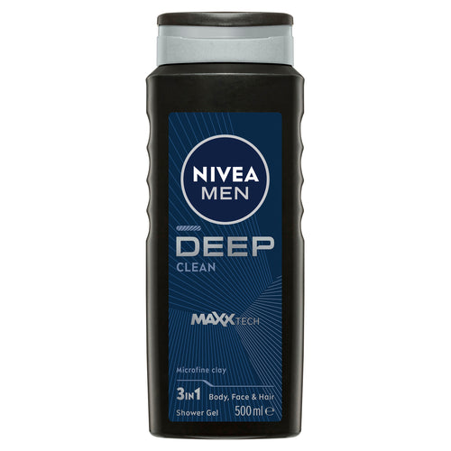 NIVEA MEN DEEP Clean Shower Gel leaves your body, face and hair feeling deeply cleansed, perfect for men who want a deep clean and refreshed shower experience. The innovative formula powered with MAXXTECH with natural-derived microfine clay absorbs impurities and cleanses your skin deeply, leaving a fresh skin feeling. The effective, yet mild gel with its dark wood fragrance transforms into a white caring foam. Simply apply the shower gel to your wet skin and massage it onto your body, face and hair before rinsing it off. The formula is 99% biodegradable*. Feel deeply clean & refreshed with NIVEA MEN Deep. *as per OECD or equivalent methods