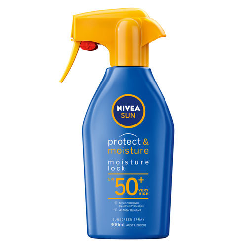 NIVEA SUN Protect & Moisture Moisture Lock SPF50+ Sunscreen Spray cares for you in more ways than one with 5in1 protection. With broad spectrum protection and a moisturising formula, this sunscreen protects you from harmful UV rays whilst nourishing your skin. With the use of NIVEA SUN Protect & Moisture Moisture Lock SPF50+ Sunscreen Spray you can expect UVA & UVB protection against skin ageing and sunburn, plus 4 hour water resistance. It has a moisturising formula with Vitamin E to help protect the skin from the drying effects of the sun and is dermatologically tested. Made in Australia.