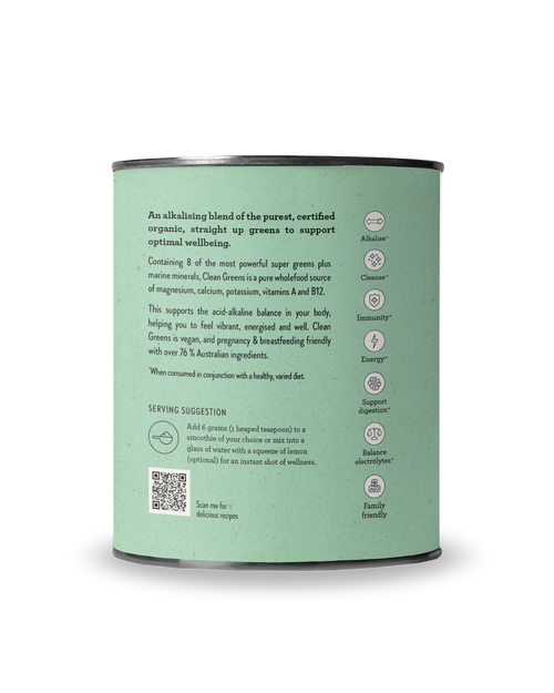 Containing 8 of the most powerful super greens plus marine minerals, Clean Greens is a pure wholefood source of magnesium, calcium, potassium, vitamins A and B12.
