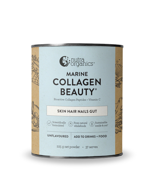 Glow from the inside out with Marine Collagen Beauty, a natural & potent formulation to support healthy skin, hair, nails & gut. This natural formulation is designed to support structural integrity of skin and decrease skin aging factors, supporting skin quality of the entire body from within. With targeted NATICOL® Bioactive Collagen Peptides, vitamin C, zinc, silica, and fucoidans all from pure wholefoods, Marine Collagen Beauty is versatile and easy to incorporate into your daily beauty routine.