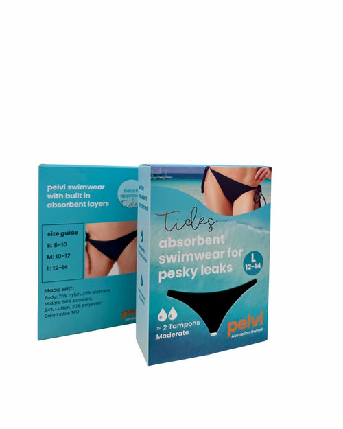 Tides by Pelvi Swimwear feature a built-in absorbent liner and leak-proof technology, so you can enjoy swimming, surfing or just relax on the beach worry free. Pelvi leakproof swimwear is designed specifically for water activity.