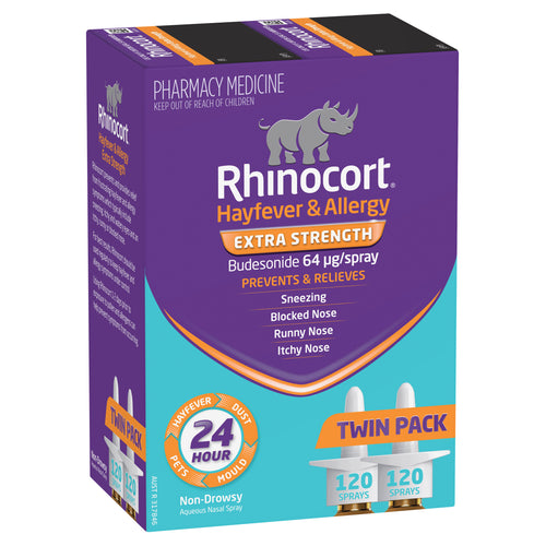 Rhinocort Extra Strength Hayfever & Allergy Non-Drowsy Nasal Spray prevents and provides relief from frustrating hayfever and allergy symptoms which typically include sneezing, itchy and watery eyes, and an itchy, runny or blocked nose. This value pack comes with 2 x 120 spray bottles of Rhinocort Extra Strength Hayfever & Allergy Non-Drowsy Nasal Spray.