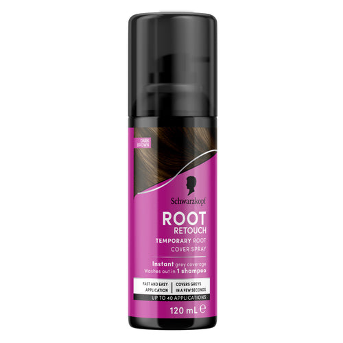 Schwarzkopf Root Retouch temporary cover spray covers greys in few seconds in the shade dark brown. Its fast and easy application provides instant grey coverage and washes out in 1 shampoo.