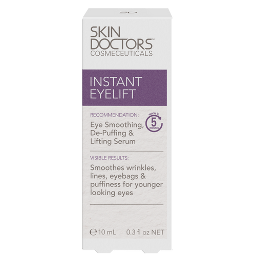 Skin Doctors™ Instant Eyelift is a lightweight, non‑comedogenic serum that creates an instant, translucent tightening film under the eyes, visibly lifting, firming, and smoothing fine lines, wrinkling, puffiness and under‑eye bags in just five minutes.