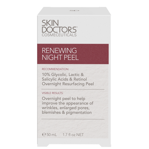 Skin Doctors Cosmeceuticals Renewing Night Peel is a potent overnight chemical peel featuring a 10% AHA blend (glycolic, lactic and salicylic acids) plus time‑release vitamin A (retinol).