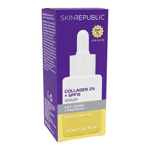 Our Anti-Aging Serum with 2% Collagen, hydrates to visibly smooth skin's appearance. More to love, it contains a broad spectrum SPF15 to provide protection against UVA and UVB rays.