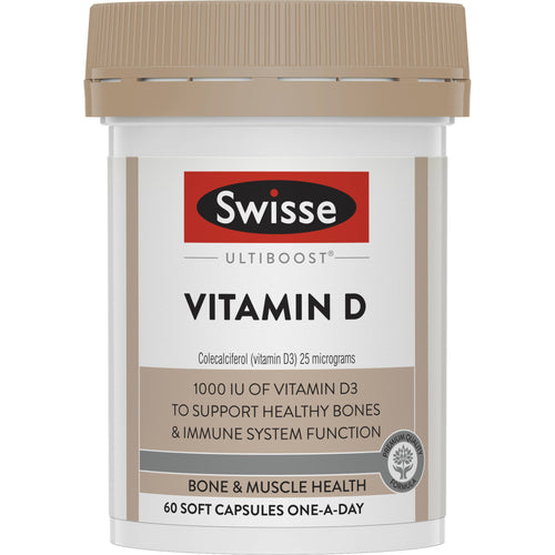 Swisse Ultiboost Vitamin D is a premium quality formula that maintains healthy bones and teeth, bone density supports the absorption of dietary calcium, and maintains immune system health and function. Vitamin D is produced by the body when it’s exposed to sunlight, however inadequate sun exposure can sometimes mean our body’s vitamin D levels are low – in fact, nearly one quarter of Australian adults are deficient in vitamin D*. This supplement contains 25 micrograms of vitamin D3, which is retained in the bloodstream more effectively when compared to vitamin D2 (a synthetic form).