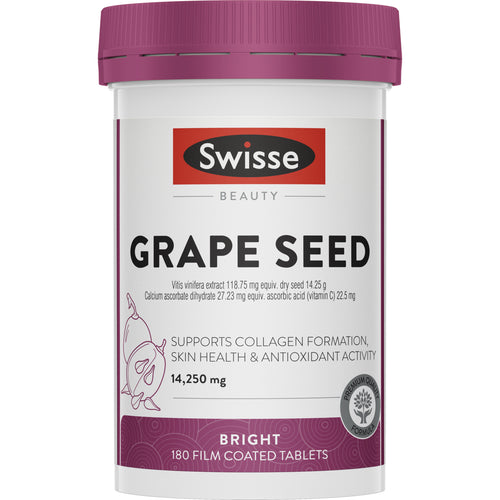 Swisse Beauty Grape Seed is an expertly formulated supplement designed for skin health. The inclusion of vitamin C supports skin health, collagen production and collagen health, while grapeseed provides antioxidant support. Grapeseed also helps to reduce mild varicose veins symptoms. Each tablet contains grape seed extract equivalent to 14.25 g of dry seed, offering high strength in every daily dose. Suitable for vegans and vegetarians, it is a good choice for anyone seeking an alternative option for skin health.