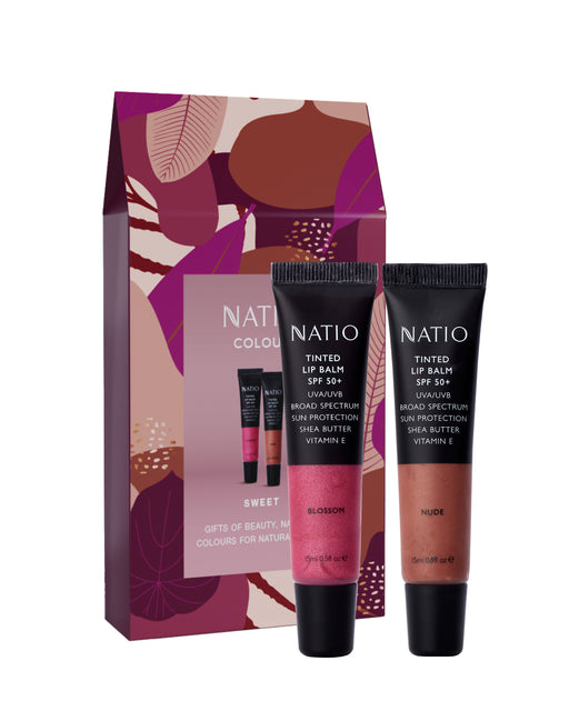 NatioIn stockSweet' gift set contains 2 x full sized Tinted Lip Balm SPF 50+ in shades "Blossom" and "Nude", ready to gift in a Natio presentation box.