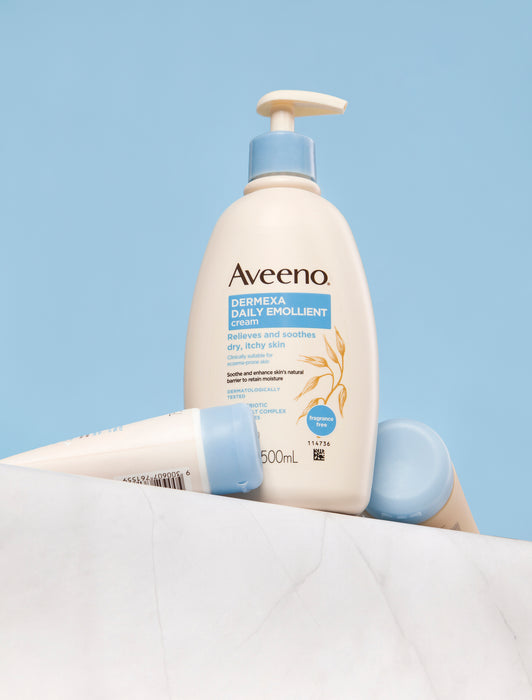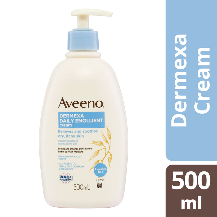Aveeno Dermexa Daily Emollient Cream Formulated with Prebiotic Triple Oat Complex contains oat extract, oat flour and oat oil to provide moisture and soothe dry, itchy skin.