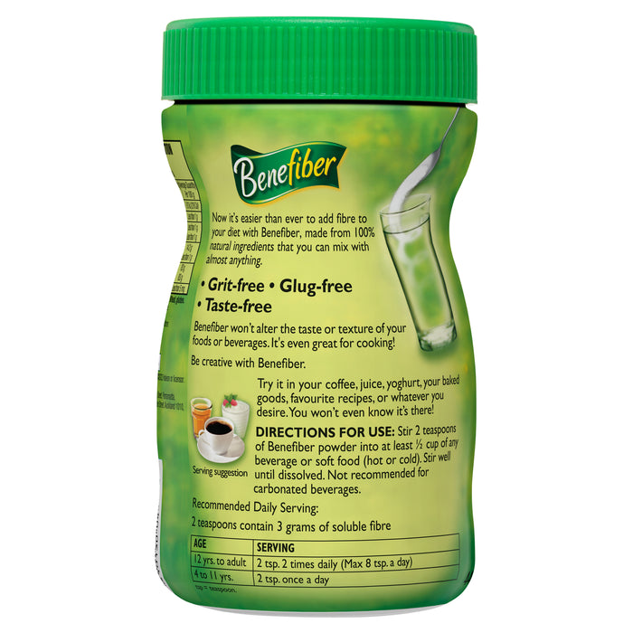 Benefiber is a daily fibre supplement made from 100% natural ingredients. Benefiber makes taking fibre easier. It dissolves in most beverages and soft foods. Taste-free, no added sugar and made from wheat.