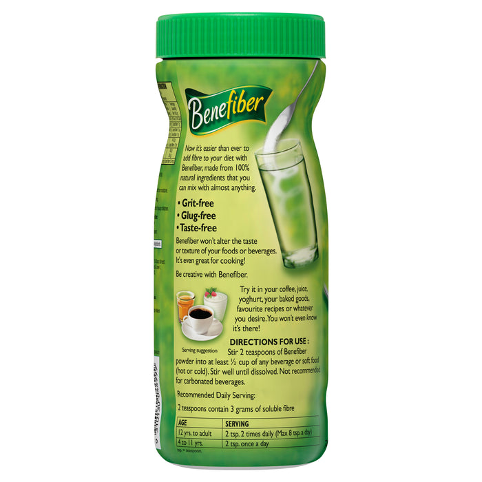 Benefiber is a daily fibre supplement made from 100% natural ingredients. Benefiber makes taking fibre easier. It dissolves in most beverages and soft foods. Taste-free, no added sugar and made from wheat. Benefiber is a taste-free, dissolvable daily fibre supplement.