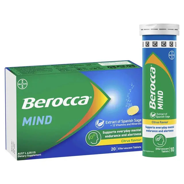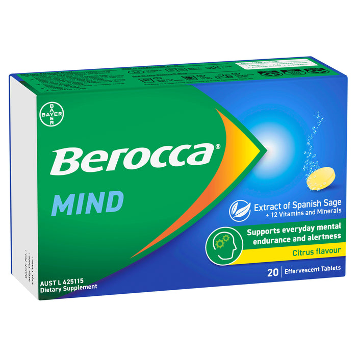 Berocca Mind is formulated with all 8 B vitamins, vitamin C, Magnesium, Zinc, Iron and Extract of Spanish Sage to support mental performance, endurance and alertness so you can stay on top of what each day brings. Berocca Mind contains Spanish Sage for supporting brain function under daily pressures so you can stay on top of what each day brings.Berocca Mind is formulated with all 8 B vitamins, vitamin C, Magnesium, Zinc, Iron and Extract of Spanish Sage to support mental performance, endurance and alertness so you can stay on top of what each day brings. Berocca Mind contains Spanish Sage for supporting brain function under daily pressures so you can stay on top of what each day brings.