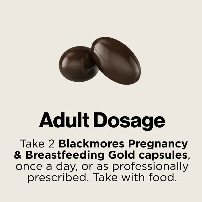Help provide nutrients for a healthy pregnancy for mum and bub. Blackmores Pregnancy and Breast-Feeding Gold capsules are formulated to provide the nutrient requirements for pregnant and breast-feeding women. This dietary breast-feeding supplement provides 20 important nutrients for mother including folic acid, iodine and vitamin D3, with supporting nutrients for baby. It also contains omega-3 DHA to support your baby’s brain and nervous system development, and a lower constipation form of iron which is gentle on the digestive system. Adults: Take two capsules once a day.