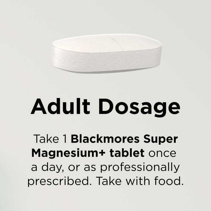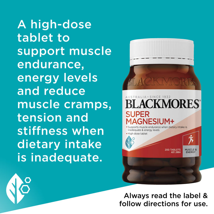Blackmores Super Magnesium+ contains two easily absorbed forms of magnesium (amino acid chelate and citrate) which help support muscle endurance, and reduce muscle cramps, tension and stiffness when dietary intake is inadequate. This high-dose tablet also supports energy levels and body electrolyte balance.