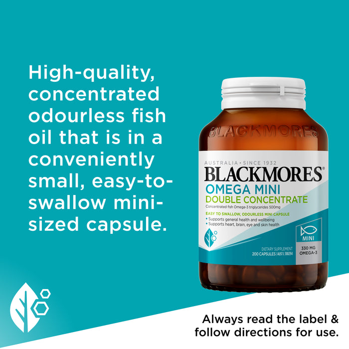 Support the health of your heart, skin, eyes and brain with Blackmores Omega Mini Double Concentrate. This is a high-quality, concentrated odourless fish oil that provides the same amount of omega-3 per capsule as our standard fish oil 1000 capsule* in a conveniently small, easy-to-swallow mini-sized capsule.**. Blackmores Omega Mini Double Concentrate is extracted from 100% wild-caught fish. The extraction process ensures purified, high-quality oil that is tested for mercury, dioxins and PCBs. *Each Blackmores' standard fish oil 1000 capsule contains 300 mg of omega-3 marine triglycerides, inclusive of 180 mg Eicosapentaenoic Acid (EPA) and 120 mg Docosahexaenoic Acid (DHA) (Total EPA + DHA= 300 mg).