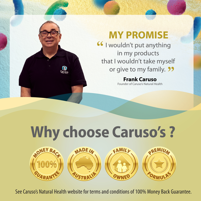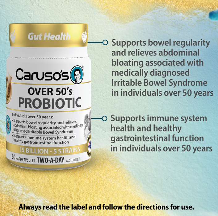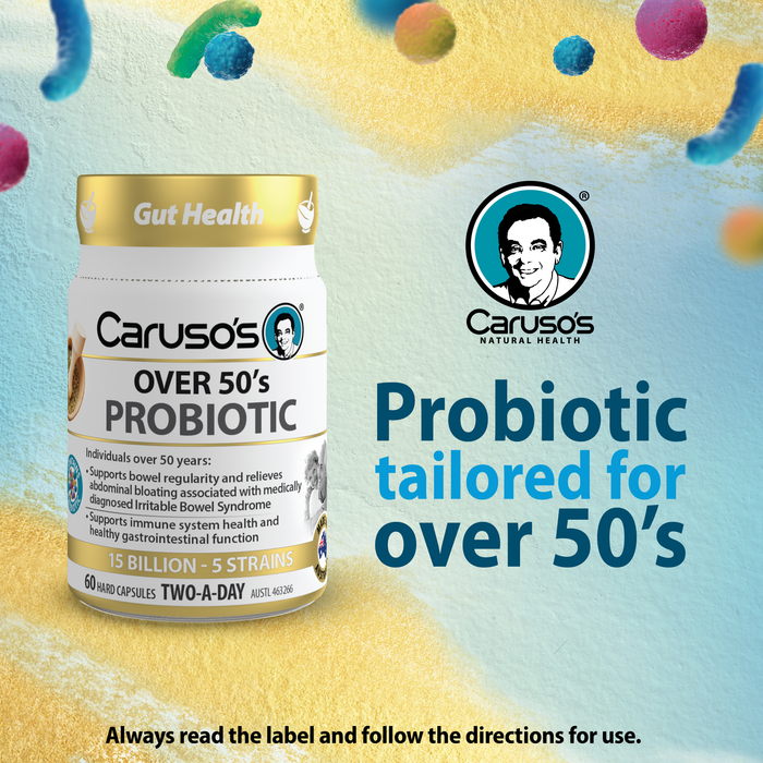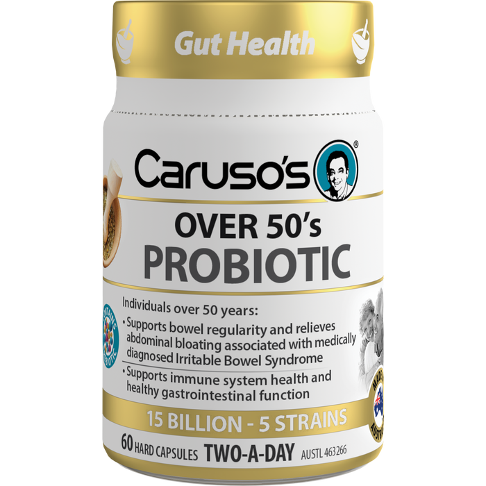 Caruso’s Over 50’s Probiotic is a multi-strain probiotic which has been specially formulated for individuals over 50 years old, to support gastrointestinal system health and helps restore beneficial bowel flora. Caruso's Over 50's Probiotic also helps to support immune system health and function in individuals over 50 years old.
