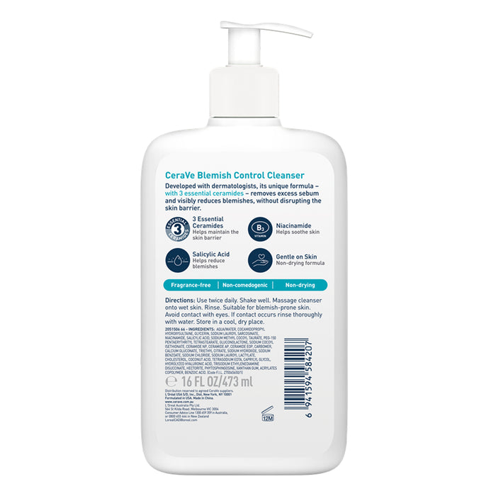 CeraVe Blemish Control Cleanser is formulated for blemish-prone skin to unclog pores, remove blemishes and excess oil, while maintaining the protective skin barrier. This cleanser features oil-absorbing technology and contains 3 essential ceramides, salicylic acid, and niacinamide to help keep skin clear and healthy-looking.