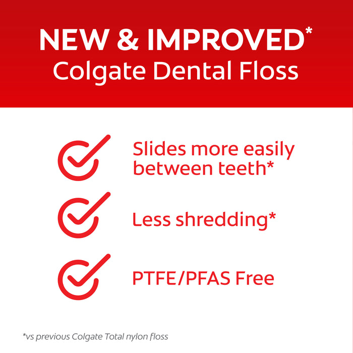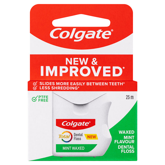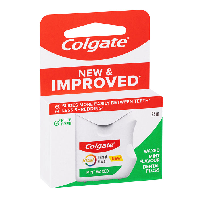 NEW AND IMPROVED* Colgate Total Mint Waxed Dental Floss slides more easily between the teeth*, less shredding* and reaches areas that brushing can't - for improved mouth health.
