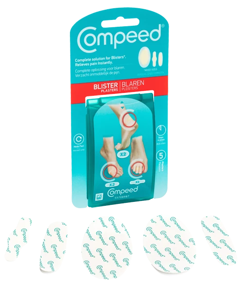 Compeed Mixed Blister Plasters are the foot blister solution:- Ready-to-go blister first-aid kit- Various plasters sizes - to cover any size blister- Pack includes: 2 x medium plasters, 2 x small plasters, 1 x on toe plasterCompeed advanced hydrocolloid technology provides the optimal healing environment to accelerate blister healing without scabbing.Complete Blister Plasters are better than regular plasters*- Heal faster- Provide instant pain relief- 3 x better cushioning- Stays in place up to 7 daysCompeed are specialists in blister care as not all blisters are the same.*Artus-Arduise et al., 2020, Hydrocolloid blister plasters vs. standard plasters for foot blisters treatment.
