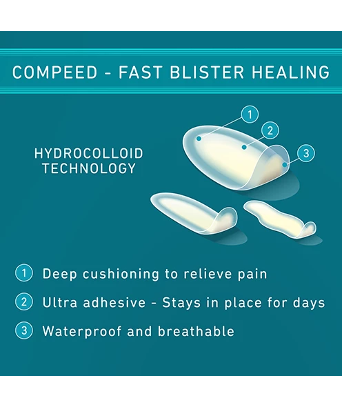 Compeed Mixed Blister Plasters are a blister first-aid kit ready to cover blisters of any size. Compeeds advanced hydrocolloid active gel technology acts like a second skin - healing blisters fast, providing instant pain relief and stays in place for up to 7 days.