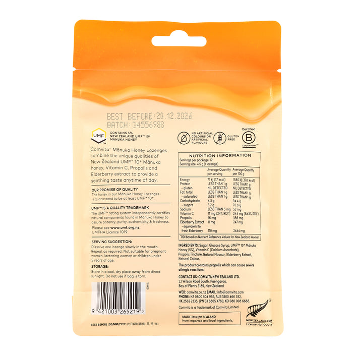 Comvita Manuka Honey Lozenges combine the unique qualities of New Zealand UMF 10+ Manuka honey, Vitamin C, Propolis and Elderberry extract to provide a soothing taste anytime of day.