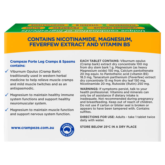 Crampeze Forte Leg Cramps & Spasms contains Viburnum Opulus, an antispasmodic (Cramp Bark) traditionally used in western herbal medicine to help relieve night cramps and mild muscle spasms & twitches. It also contains nicotinamide, feverfew extract and vitamin B5.